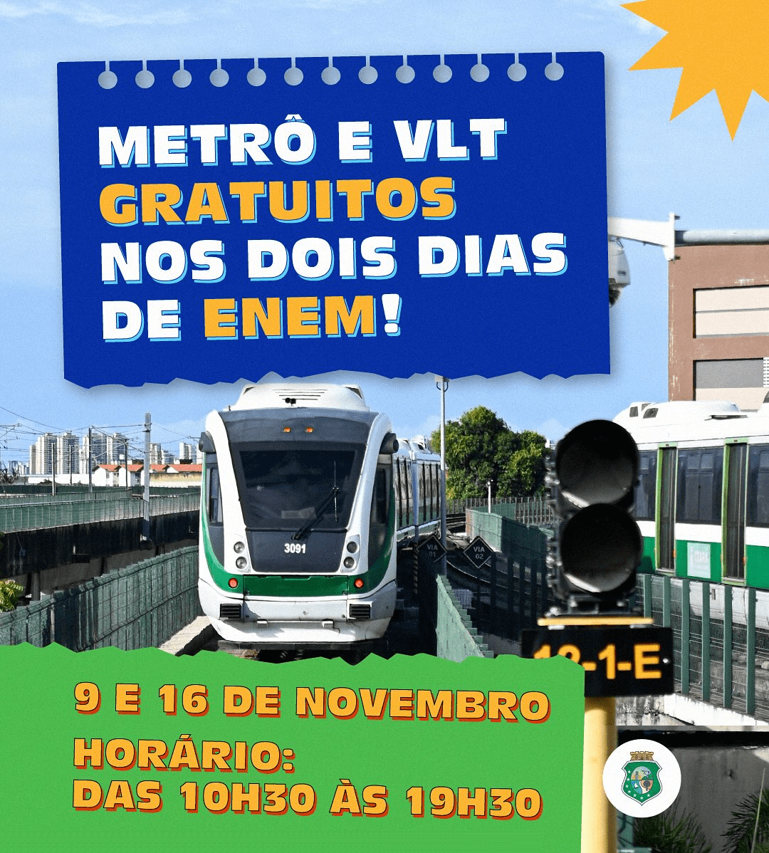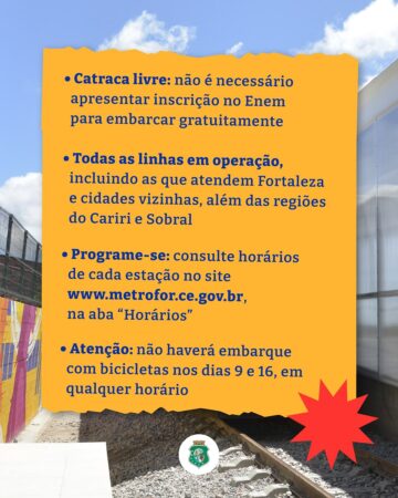 O governador Elmano de Freitas confirmou que o metrô e os VLTs terão viagens gratuitas e funcionamento especial nos dias 9 e 16 de novembro, quando serão aplicadas as provas do Enem 2025. A medida vale para todos os passageiros, sem necessidade de apresentar inscrição.