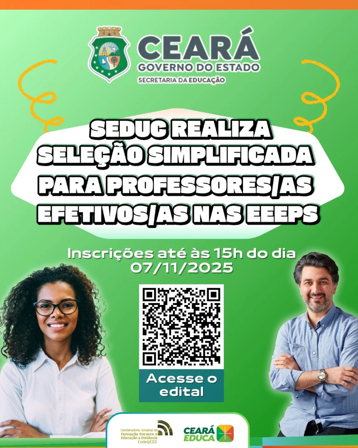 A Secretaria da Educação do Ceará (Seduc) está com inscrições abertas para o processo seletivo simplificado para professores/as efetivos/as, para os componentes curriculares nas Escolas Estaduais de Educação Profissional (EEEPs).
