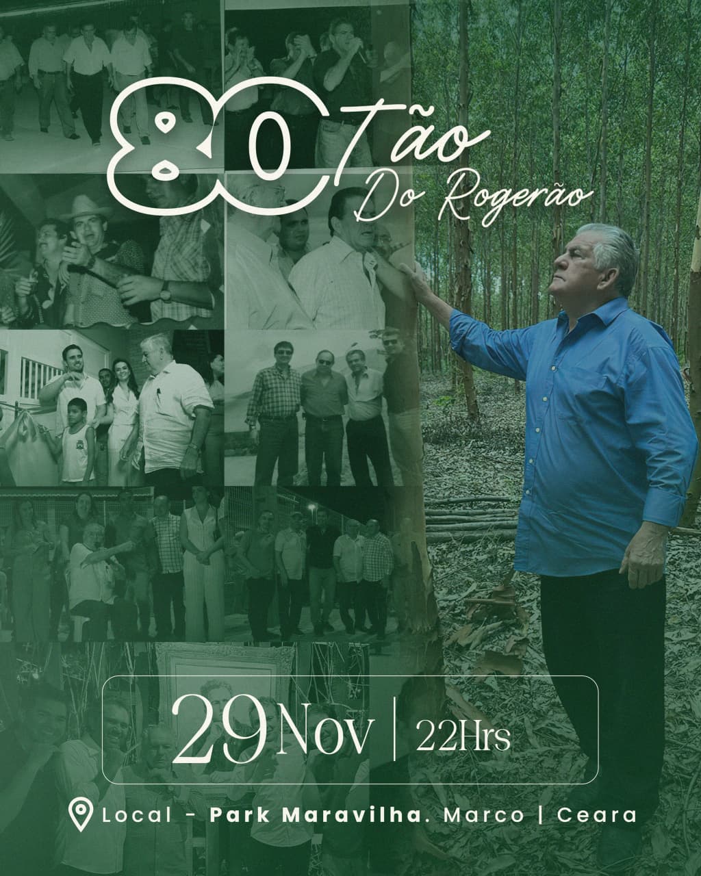 Uma celebração grandiosa está sendo organizada para marcar os 80 anos do ex-deputado estadual Rogério Aguiar, líder político de trajetória extensa e amplamente reconhecido em todo o Vale do Acaraú. O evento, chamado “80tão do Rogerão”, ocorrerá no dia 29 de novembro, a partir das 22h, no Parque Maravilha, situado na sede do município de Marco, no Ceará.