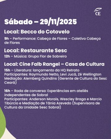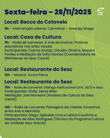 Sobral se prepara para vivenciar três dias dedicados à arte e à criatividade. De 27 a 29 de novembro, a Mostra Sesc de Artes Visuais chega à cidade com uma programação totalmente gratuita, reunindo exposições, performances, rodas de conversa e atividades que aproximam o público da produção artística cearense.
