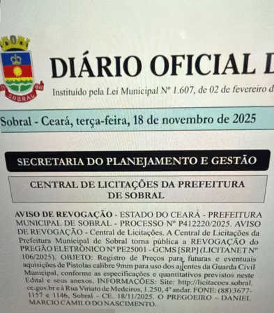 A Prefeitura de Sobral revogou o pregão eletrônico que previa o registro de preços para a futura compra de pistolas calibre 9 mm destinadas à Guarda Civil Municipal. A decisão foi publicada no Diário Oficial do Município do dia 18 de novembro de 2025.