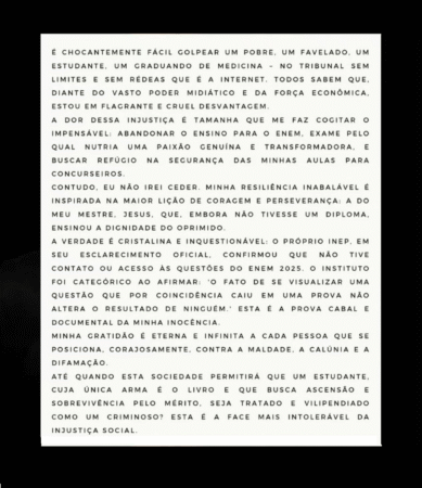 Nas redes sociais, Edcley Teixeira divulgou uma nota afirmando sua paixão pelo Enem e sua dedicação aos estudos. No entanto, o estudante revelou que cogita deixar de ensinar em cursos preparatórios após toda a repercussão. Ele também agradeceu às pessoas que têm manifestado apoio neste momento.