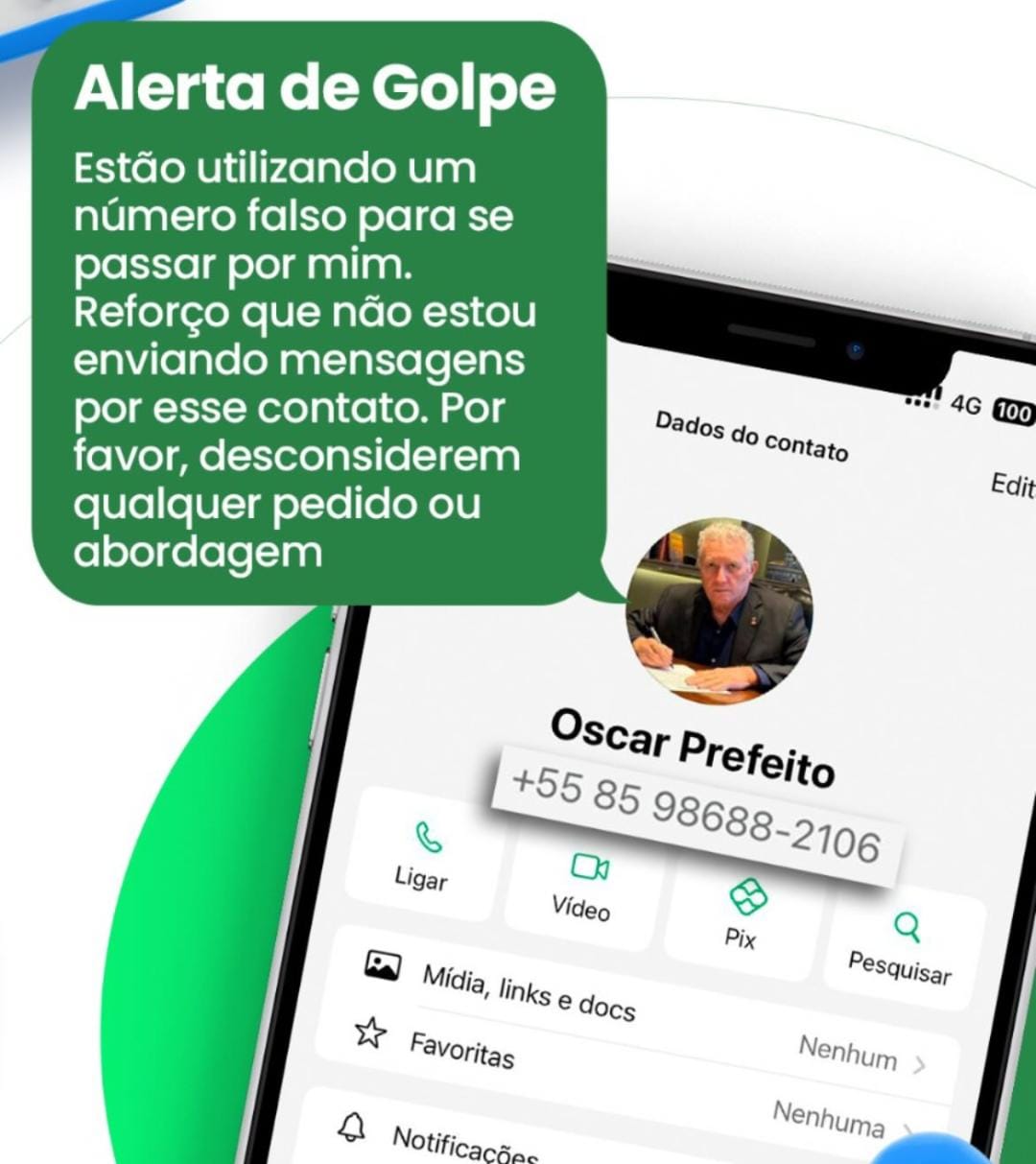 O prefeito Oscar Rodrigues emitiu um alerta à população após golpistas começarem a utilizar um número falso de WhatsApp para se passar por ele. De acordo com a comunicação divulgada, o gestor reforça que não está enviando mensagens por esse contato e que qualquer abordagem ou pedido deve ser desconsiderado imediatamente.