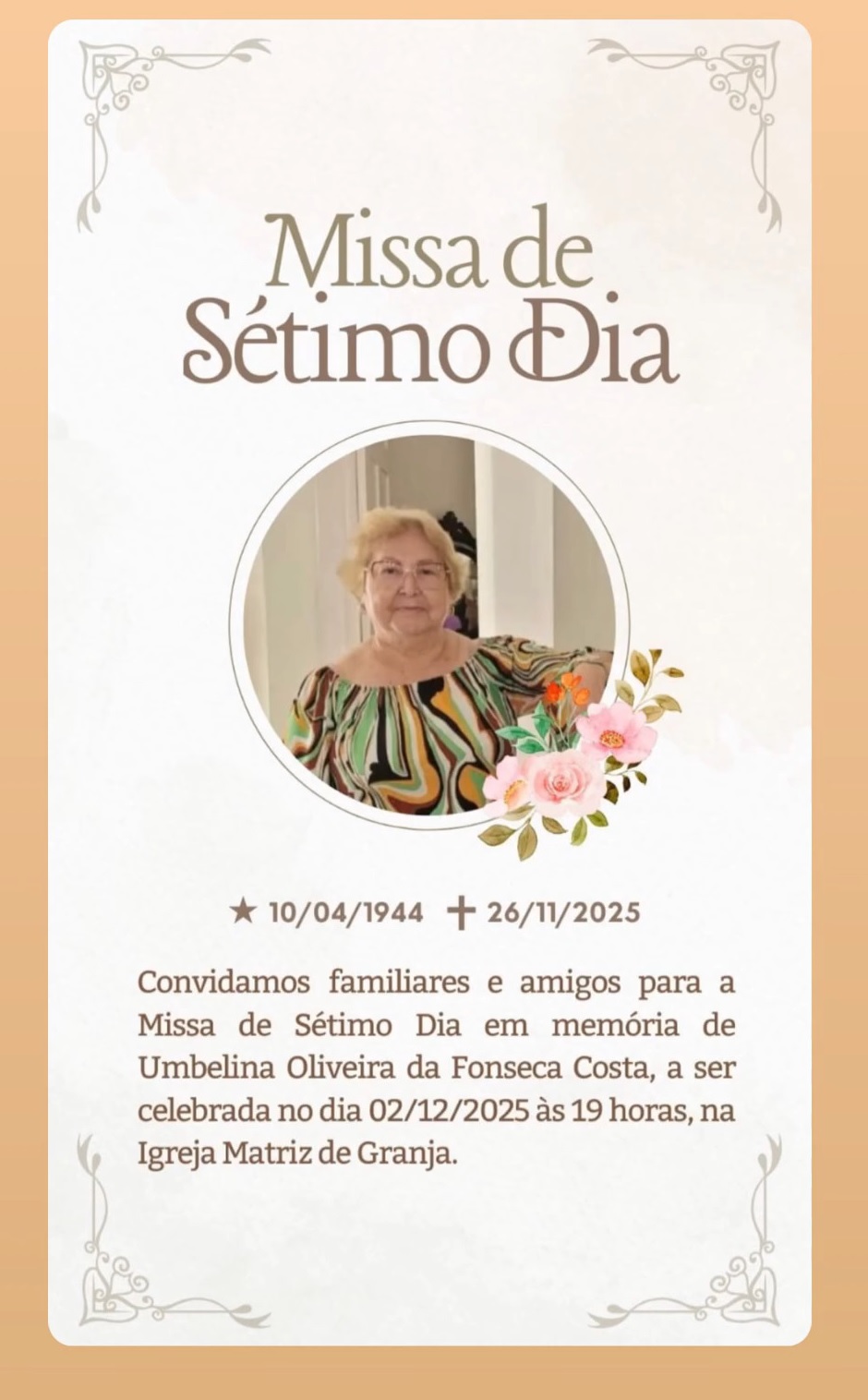 A família de Umbelina Oliveira da Fonseca Costa convida parentes e amigos para a Missa de Sétimo Dia, que será celebrada nesta terça-feira, 2 de dezembro de 2025, às 19h, na Igreja Matriz de Granja.