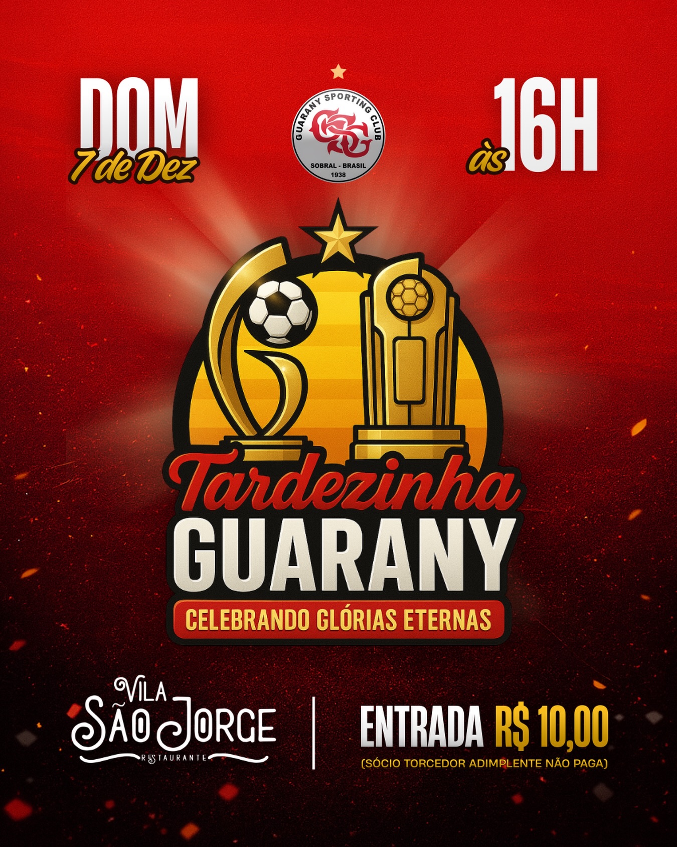 Trabalhando para manter ativo o vinculo com os torcedores durante esse período sem atividades do time principal, a diretoria do Guarany de Sobral promove no próximo domingo, 7 de dezembro, a ‘Tardezinha Guarany – Celebrando Glórias Eternas’. O evento marca a celebração marca duas datas especiais para o Cacique Imortal: os 15 anos do título nacional da Série D (2010) e os 10 anos da Taça Fares Lopes (2015).