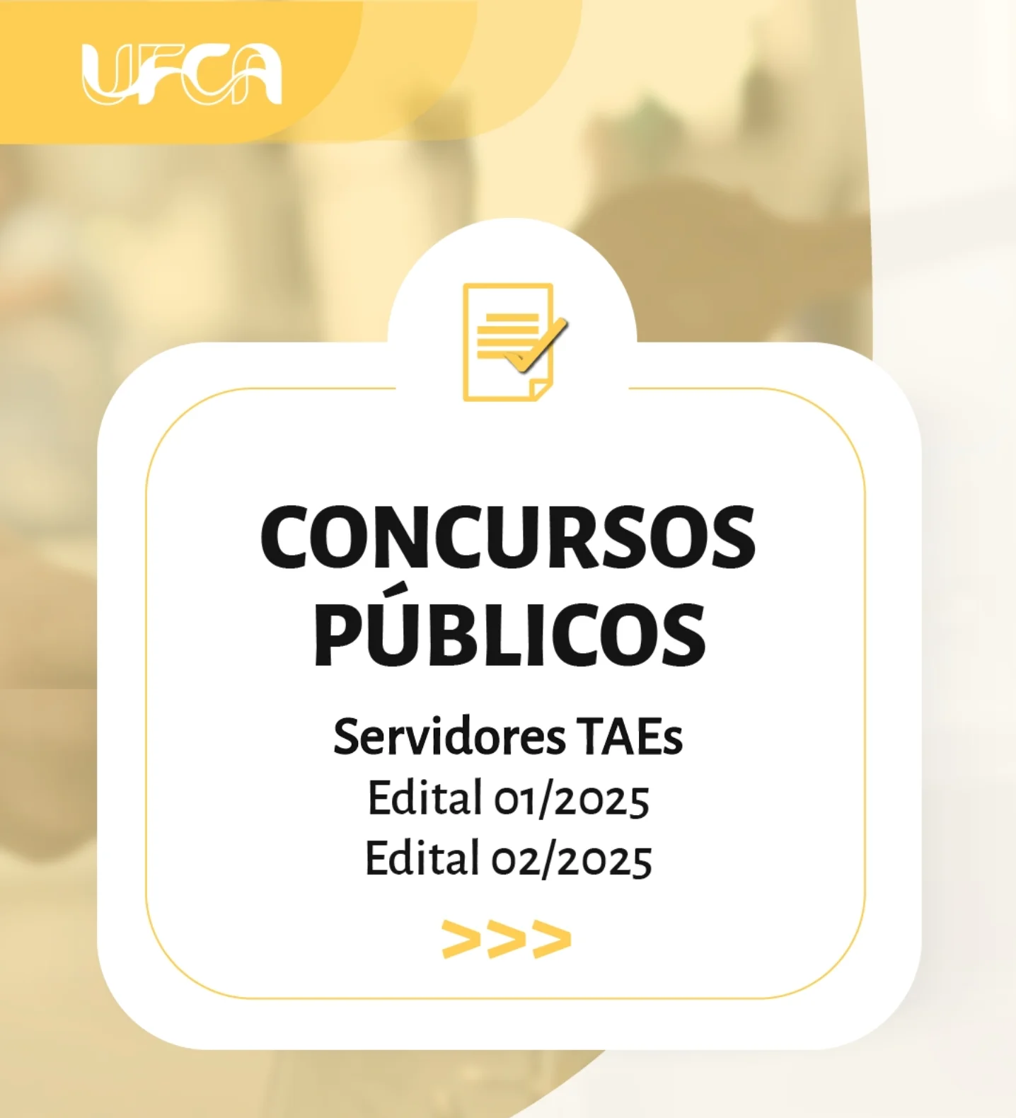 A Universidade Federal do Cariri (UFCA) está com dois editais abertos visando selecionar novos servidores técnico-administrativos em educação (TAEs), por meio de concurso público. As seleções são regidas pelos editais Nº 01/2025 e Nº 02/2025, da Pró-Reitoria de Gestão de Pessoas (Progep/UFCA). Ao todo, os dois editais ofertam 22 vagas: 10 para nível D (médio ou técnico) e 12 para nível E (superior). A prova será aplicada no dia 8 de março de 2026 – preferencialmente em Juazeiro do Norte.