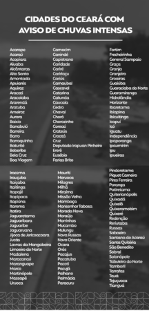 O órgão emitiu aviso laranja (nível 2 de gravidade) para 166 municípios de quase todo o território cearense, devido à intensidade das chuvas e dos ventos, que podem chegar à velocidade de 100 km/h.