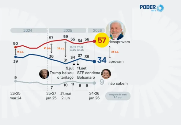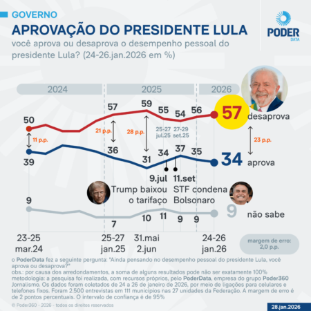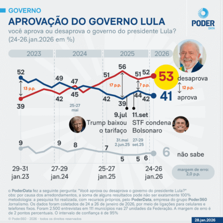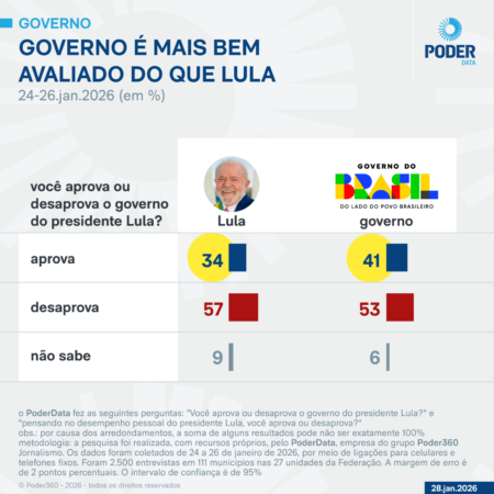 A avaliação que os eleitores fazem do petista é pior do que a que fazem do governo como um todo: 53% desaprovam e 41% aprovam. Os dados são de pesquisa do PoderData realizada de 24 a 26 de janeiro de 2026.