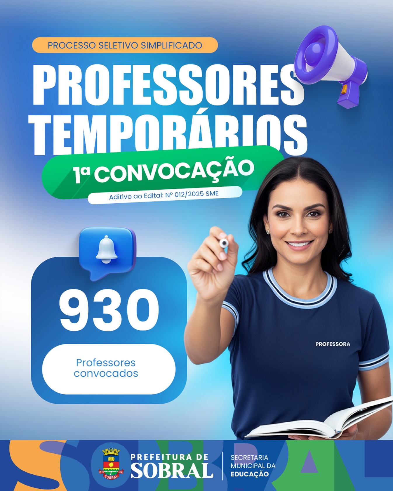 A 1ª convocação do Processo Seletivo Simplificado para Professores Temporários já foi oficialmente divulgada pela Prefeitura de Sobral, por meio da Secretaria Municipal da Educação de Sobral.