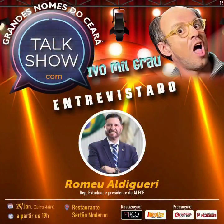 Sobral recebe nesta quinta-feira (29/1) um dos nomes mais influentes da política cearense. O presidente da Assembleia Legislativa do Ceará, Romeu Aldigueri, desembarca na cidade para participar do Talk Show com Ivo Mil Grau, um evento que já é sucesso antes mesmo de começar.