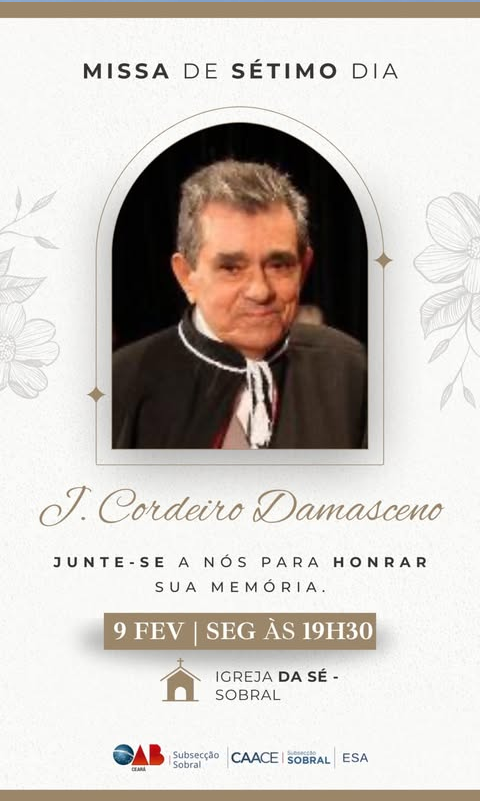 A OAB Sobral convida a advocacia, familiares e amigos para a Missa de Sétimo Dia em memória de José Cordeiro Damasceno, que será realizada nesta segunda-feira, 9 de fevereiro, às 19h30, na Igreja da Sé de Sobral.