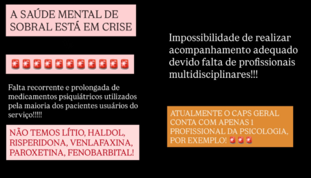 Por meio do manifesto “A saúde mental em Sobral vive um momento crítico”, o grupo relata uma grave deterioração das condições de atendimento nos serviços de atenção psicossocial, resultado da redução progressiva das equipes, da precarização da estrutura física e da falta de condições básicas de funcionamento.