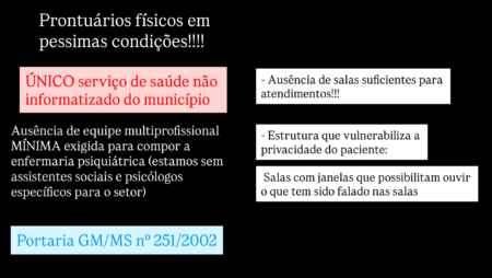 Outro ponto crítico diz respeito à estrutura física dos serviços, considerada inadequada. Há relatos de prontuários físicos em péssimas condições, falta de salas suficientes para atendimento e ambientes que comprometem a privacidade dos pacientes, com consultórios cujas janelas permitem que conversas sejam ouvidas do lado externo.