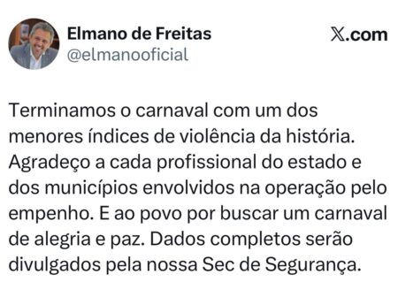 Elmano também agradeceu aos profissionais envolvidos na operação especial de Carnaval e à população cearense. “Ao povo por buscar um carnaval de alegria e paz”, escreveu.