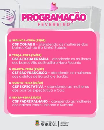 A Prefeitura de Sobral, por meio da Secretaria da Saúde, promove, no período de 23 a 27 de fevereiro, mais uma ação do Caminhão da Mamografia. A unidade móvel estará nos Centros de Saúde da Família (CSFs), ofertando exames de mamografia para mulheres a partir de 40 anos.