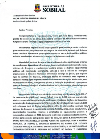 Agora é oficial. Francisco Hermenegildo Sousa Neto pediu exoneração da Secretaria da Infraestrutura de Sobral após 13 meses à frente da Pasta. Em carta ao prefeito Oscar Rodrigues, agradeceu a oportunidade e destacou as ações realizadas no período.