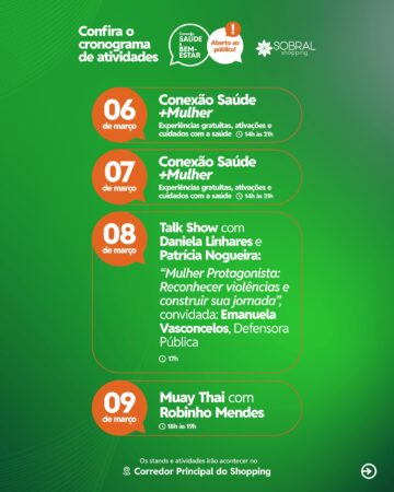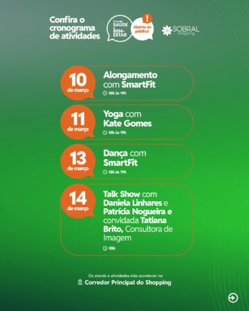 O Sobral Shopping divulgou a programação especial para o mês de março, com uma agenda recheada de atividades voltadas à saúde, bem-estar e qualidade de vida.