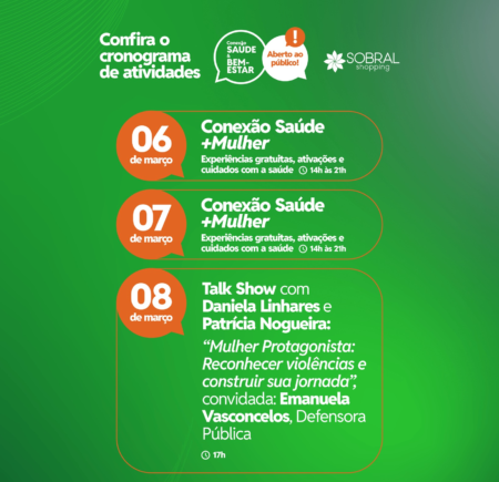 A partir desta sexta-feira (6), o Sobral Shopping entra no clima das comemorações pelo Dia Internacional da Mulher com a realização do evento Conexão Saúde, voltado para o cuidado com o corpo e a mente.