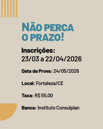 As vagas são para atuação em Fortaleza, com jornada de trabalho de 30 horas semanais, o que torna o certame ainda mais atrativo para quem busca estabilidade e qualidade de vida.