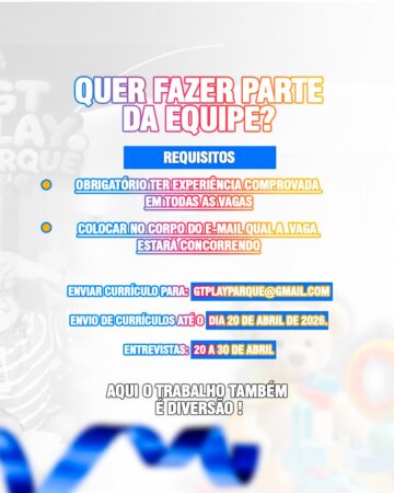 A GT Play Parque está abrindo as portas e estamos contratando pessoas incríveis para fazer parte da nossa equipe! 💙